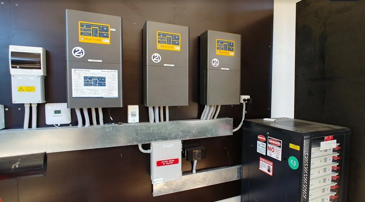 The heart of any off-grid power system is the inverter/charger — a device that converts solar and battery power into 240V AC to run your appliances, while also managing battery charging and a backup generator. In larger systems, multiple inverters may be used to deliver three-phase power or handle large peak loads.